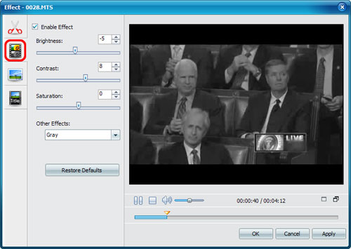 Before editing, select a video file you want from the file list and click "Effect" button on the toolbar to open "Effect" window.