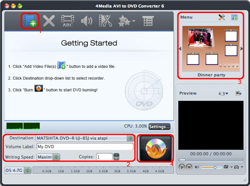 4Media AVI to DVD Converter for Mac allows you to create DVD movies from AVI, MPEG, VOB, DAT, M2V, MPG format video files. Here is a quick step-by-step guide to get you started.