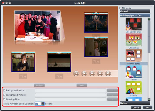 Click the "Edit" button next to the "Templates" button to bring up the Menu Edit window, from there you can change the template, add background music/picture, title and opening film to your menu.