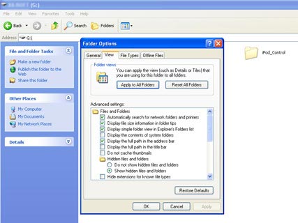 In the iPod folder, click "Tools" on the above of this window, choose "Folder Options" and click the "View" tab. You'll see a bunch of advanced settings for how Windows displays file information. In the "Hidden files and folders" section, select "Show hidden files and folders," then click OK.