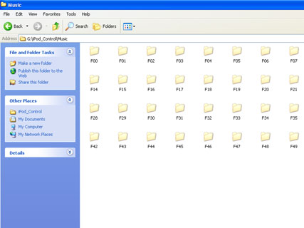 Here's neck of the bottle. In the iPod folder, you'll now see a few new, half-grayed-out folders. Double-click the one called iPod_Control. Then double-click the Music folder. See all of those numbered folders in there? Each one contains between 40 and 60 or so of your iPod's songs.