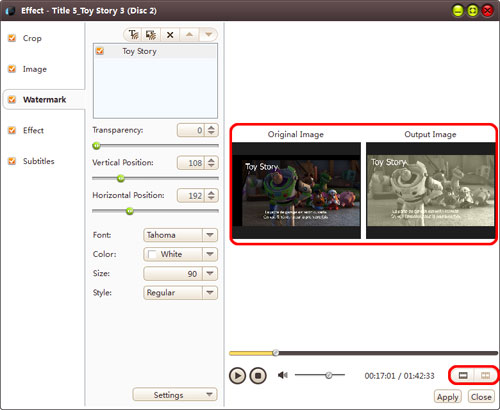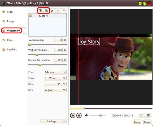 In "Watermark" tab, click "Add Text Watermark" or "Add Picture Watermark" button to import watermarks into the watermark list. Select a watermark and set its transparency, vertical position, horizontal position, font, color, size or style .