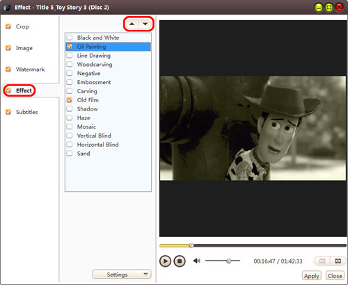 In "Effect" tab, choose one or more effects for the output video from the effect list.