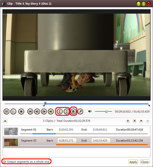 At first, choose the video file you want to clip. Then click "Clip" button on the toolbar to enter "Clip" window. Set the start & end point to get the partial segment and repeat the action to get several segments at will. After clipping, check the "Output segments as a whole one" option and merge the segments in the list into one file. And then click "Move Up" or "Move Down" button to specify the sequence of these segments.