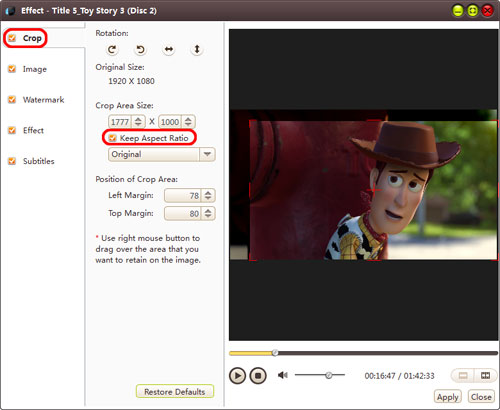 Besides, you can also check "Keep Aspect Ratio" option and choose the aspect ratio from the drop-down list. Click "Restore Defaults" to restore all settings to default, and preview the real-time effect in preview window on the right.