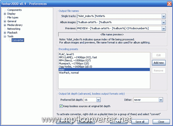Run Foobar 2000 v0.9, choose File -->Preferences-->Tools-->Converter, then click "Add New" in the below picture.