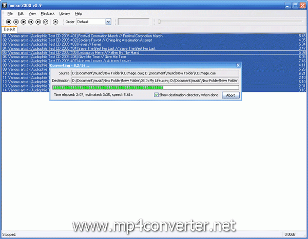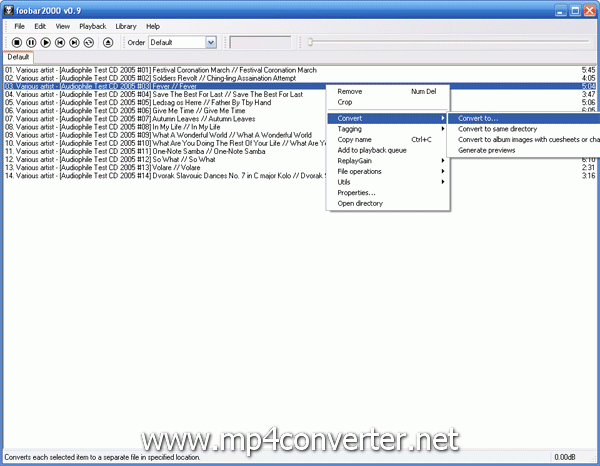 If your ape file includes multi track, you need to load the .cue file in foobar 2000. Please click "File", point to and click "Add files", when CUE file is loaded, you'll see all of the audio tracks listed under current playlist. Right click the music file you want to convert, select "Convert", then choose"Convert to...", like what I did in the below picture.