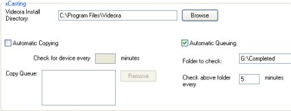 For xCasting you need to select where you installed Videora before you can configure it. Check the box for “Automatic Queuing” and choose the directory where your completed downloads are stored. Pick a time interval to check the directory. Click “Save”.