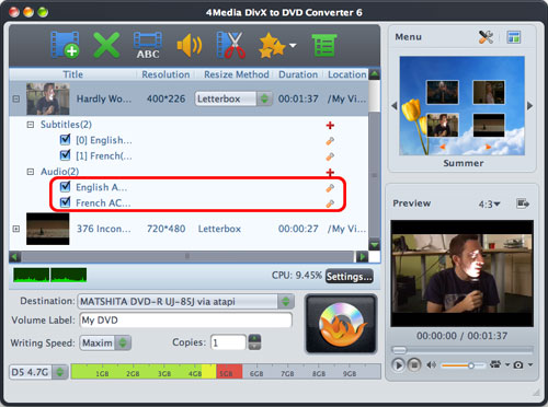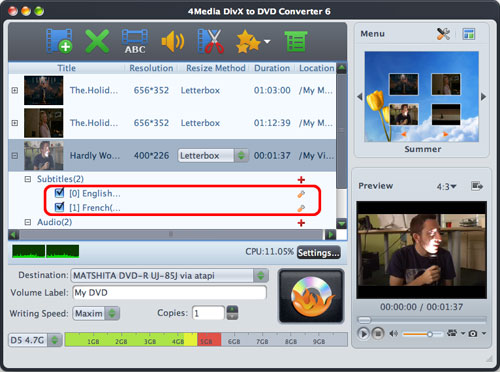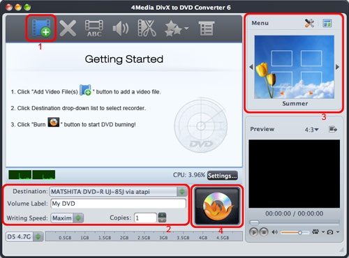 4Media DivX to DVD Converter for Mac allows you to create DVD movies from DivX, XviD, AVI, AVI HD format video files. Here is a quick step-by-step guide to get you started.