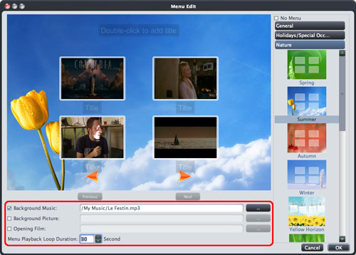Click the "Edit" button next to the "Templates" button to bring up the Menu Edit window, from there you can change the template, add background music/picture, title and opening film to your menu.