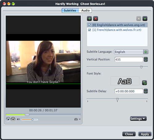 Step 1: Select a video file from the File List, and then click the "Subtitles" button on the Toolbar to bring up the Subtitles window. Click the "+" sign on the right panel and choose the subtitle file you wish to add in the dialog that opens, the subtitle file will then be displayed in the Subtitle List. You can add up to 32 subtitle files per video.