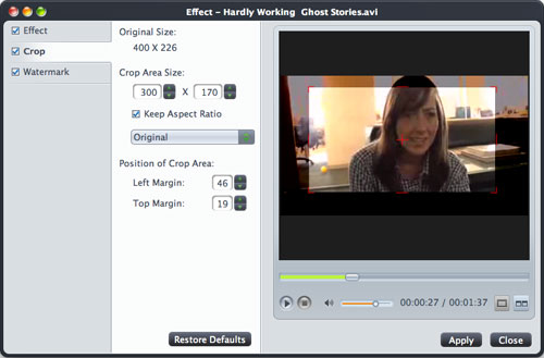 Step 2: From the "Crop" tab, enter the height and width of the crop area in the corresponding textboxes below the "Crop Area Size" label to set the crop area. Enter the values of Left Margin and Top Margin in the corresponding textboxes below the "Position of Crop Area" label to adjust the position of the crop area. Choose an aspect radio from the "Keep Aspect Ratio" drop-down menu.