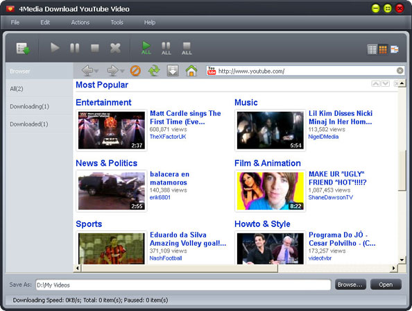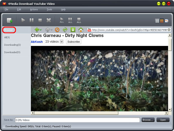 Click on "Browser" tab on the left of window and then click Homepage button to open the homepage of YouTube.com and select videos to personal preference. Click on a video to play it in the window. If you want to download videos and save them on local computer, you can click "Download" button to add the videos into the downloading file list.