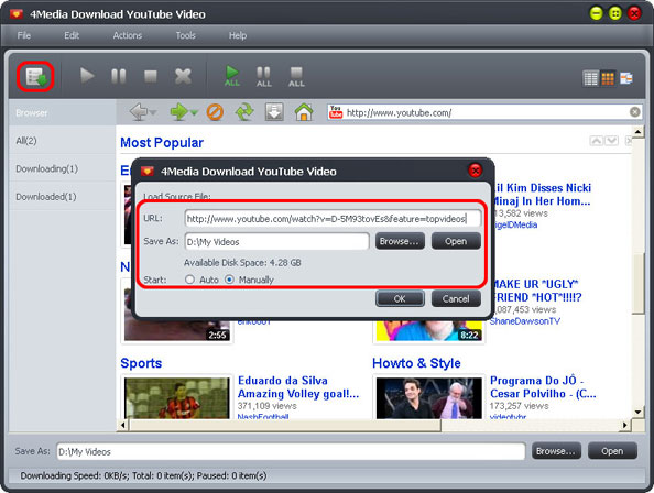 2. Right click the YouTube video thumbnail or URL, and select "Download with 4Media Download YouTube Video" option from the right-click menu, then the "New Download" dialog appears, and the video URL is automatically added into the "URL" textbox.