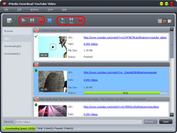 2. You can click "Start All" button on the toolbar to start downloading and converting all the files in the file list, and control the converting process by the "Pause", "Stop", "Pause All", "Stop All" and "Remove" buttons.