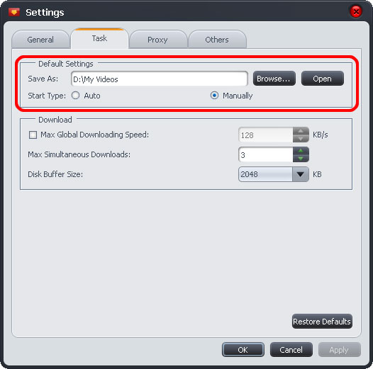 Click "Tools > Settings" option from the main menu to open the "Settings" window, then click the "Task" tab and set the "Destination" and "Start Task" options in the "Task Default Configuration" area according to your own needs.