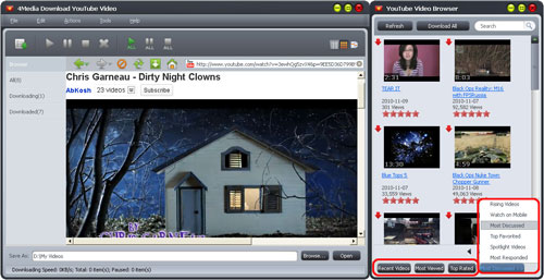 Click "Browse videos" button on the toolbar or click "Tools > Browser..." option to open the "YouTube Video Browser" window, and use the filter buttons at the bottom to browse the YouTube videos by different categories: Recent Videos, Most Viewed, Top Rated, Most Responded, Spotlight Videos, Top Favorite, Watch on Mobile, Most Discussed and Rising Videos.