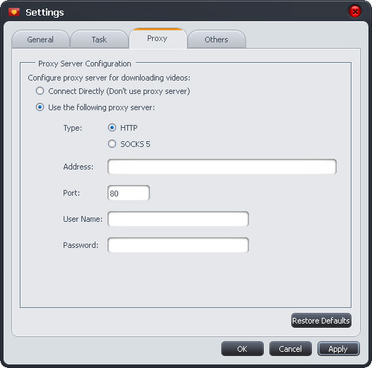 1. If your Internet Service Provider blocked YouTube site, you can bypass the firewall by setting the proxy server as below: Open the "Tools > Settings > Proxy" tab, choose the proxy server type, enter the address and port of the proxy server, and if necessary, enter the user name and password, then click "OK" button to return to the main window and retry the downloading.