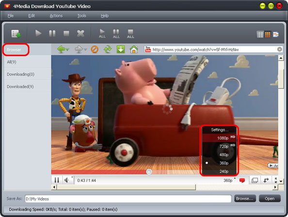 You are free to choose the resolutions of videos and download YouTube HD videos to local computer. Preview a HD video in the embedded web browser. During the preview, click "Resolution" button and select needed resolution in the menu. Click on the "Download" button on the toolbar to create the downloading task and start downloading HD video.