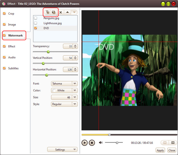 Additionally, it can help you clip DVD segment, crop DVD size, edit DVD effects, add audiotracks and subtitles, and add DVD watermark, to get the customized DVD video and audio files.