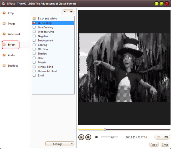 In "Effect" tab, choose one or more effects for the output video from the effect list.