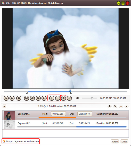 At first, choose a video file you want to clip. Then click "Clip" button on the toolbar to enter "Clip" window. Set the start & end point to get the partial segment and repeat the action to get several segments at will. After clipping, check the "Output segments as a whole one" option and merge the segments in the list into one file. And then click "Move Up" or "Move Down" button to specify the sequence of these segments.