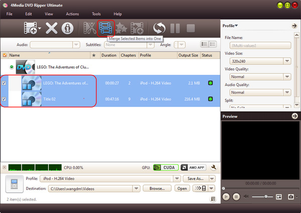Select multiple files and click "Merge Selected Items into One" button on the toolbar to merge the selected files into one and create a merged item in the file list.