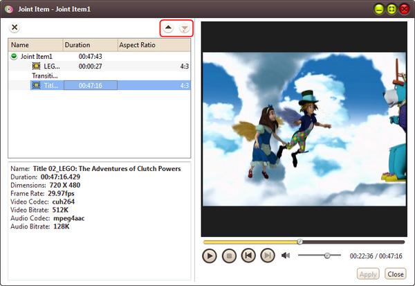 Firstly, right-click a merged video item in the file list, and select "Edit Joint Item" option from the right-click menu to open "Joint Item" window. Then select a video transition item and choose a transition effect from the transition panel on the left. Repeat this step to add transition effects to other videos. After adding transitions, choose a time length from "Duration" drop-down list as the transitional duration, and use "Move Up" or "Move Down" option to adjust the order of video items.