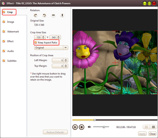 Besides, you can also check "Keep Aspect Ratio" option and choose the aspect ratio from the drop-down list. Click "Restore Defaults" to restore all settings to default, and preview the real-time efxfect in preview window on the right.