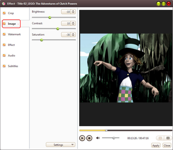 On "Image" tab, enter the value of the brightness/contrast/saturation in corresponding textboxes to set the video image's brightness/contrast/saturation.