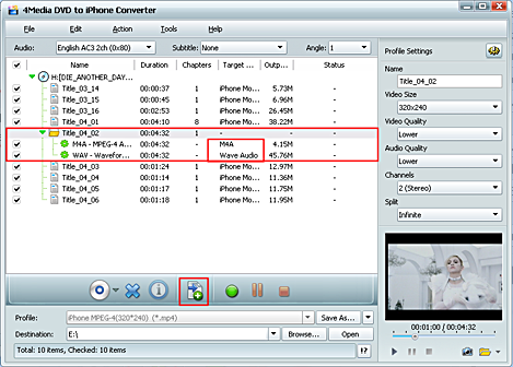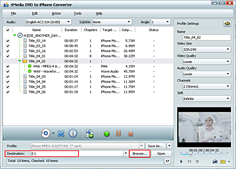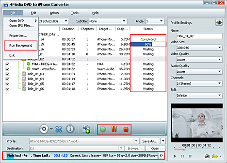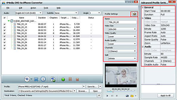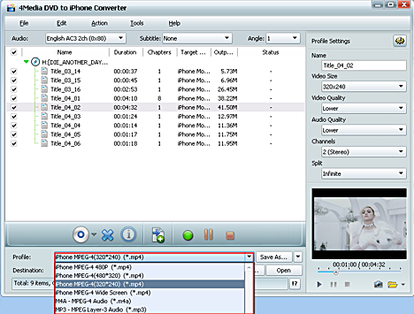 Compared with other DVD to iPhone Converter software, 4media DVD to iPhone Converter has more settings you can customize, e.g. convert DVD to iPhone MP4 video by custom file size through setting video bitrate, convert DVD's any segment, select target subtitle, move position of the subtitle, or select audio track.
