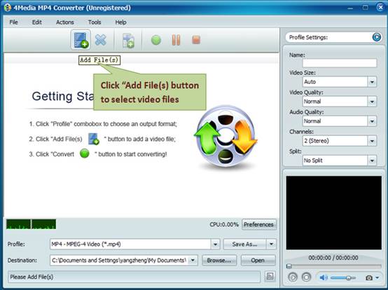 Click "Add File(s)" button on the top of the main window to select video file(s) you would to convert to MP4, they can be AVI, DivX, XviD, MPEG, WMV, MOV, ASF, MOD, QT (QuickTime) or VOB format.