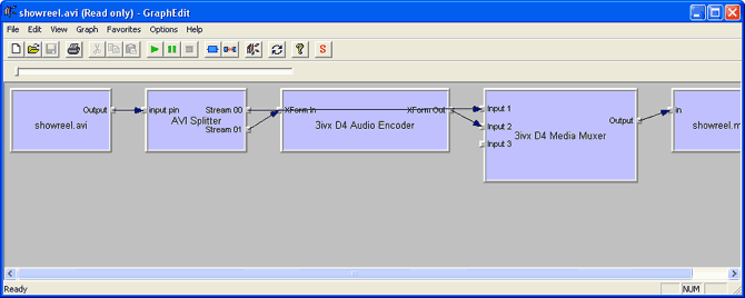 GraphEdit works by designing a Compression Graph made up of filters. In this guide we will start with an AVI file that has been encoded with VirtualDub and 3ivx D4 4.5. The AVI file contains an MPEG-4 Video track as well as an Uncompressed stereo Audio track. It is also possible to have an AVI file with just the MPEG-4 Video and a seperate WAV or similar file with the Audio. |