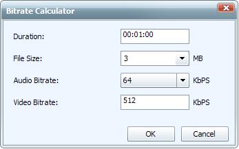 Click "Tools > Bitrate Calculator" option, then enter the size you want in the "File Size" textbox, and choose desired audio bit rate. The video bit rate will be calculated promptly. Click "OK", then the entered size will be displayed in the "Output Size" column of the file list, and the bit rate will be changed in the "Advanced Profile Settings" panel.
