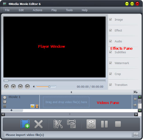 1. Create a new movie in 4Media Movie Editor File menu and select "Import File(s)...", or directly drag and drop your videos into videos pane.