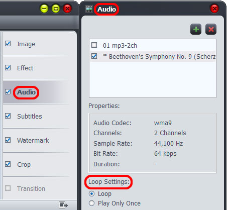4. Play the video with the music, adjust the volume as you need, and choose loop mode.