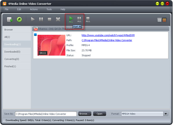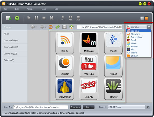 4Media Online Video Converter is a combination of viewer, converter as well as converter of online videos from multiple popular online videos websites. Embedded with a web browser, you can directly log on homepage of online video websites, viewing videos on line, downloading your favorite ones and convert them to SD and HD videos in most common formats within one step. Easy way to download and convert online videos from YouTube, Metacafe, Dailymotion, Break, Vimeo, Revver, Blip, Vidilife, and Stickam these 9 online video sites.