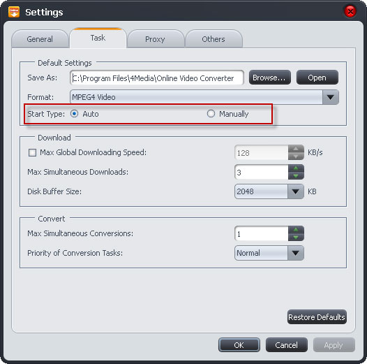 Manual mode and auto mode are available after initiating a new downloading task. You can set the downloading mode in Tools=>Settings=>Tasks=>Start Type. If you select Manual mode, you have to start the downloading tasks manually in tasks list under "Downloading" tab.