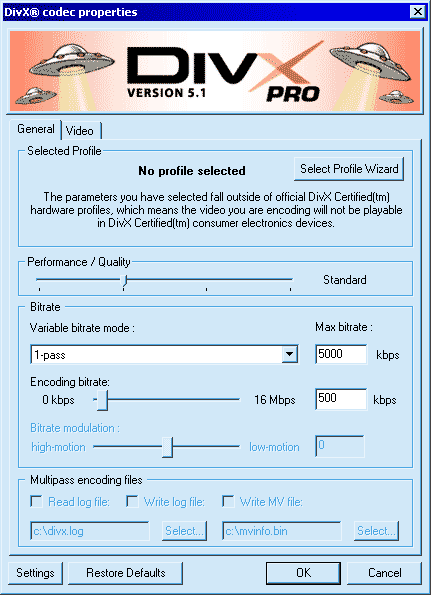 For even more detailed information on configuring DivX, be sure to check out DivX.com's Official 5.1 Guide (local mirror). It covers all the DivX settings, what they do, and how to get the most out of them - all in a very readable and easy to understand format. This guide even has its own little VirtualDub tutorial. Well worth the read for the advanced encoder. There are a few important notes you should keep in mind as you read the Official DivX Guide if you are encoding for Archos PVPs:
