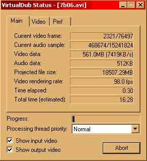 - Click on Start, and VDub will go off and process the two, and you'll end up with the two files specified.