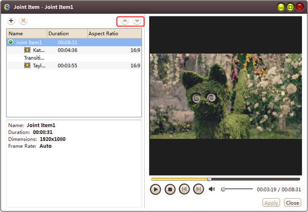 Firstly, right-click a merged video item in the file list, and select “Edit Joint Item” option from the right-click menu to open “Joint Item” window. Then select a video transition item and choose a transition effect from the transition panel on the left. Repeat this step to add transition effects to other videos. After adding transitions, choose a time length from “Duration” drop-down list as the transitional duration, and use “Move Up” or “Move Down” option to adjust the order of video items.
