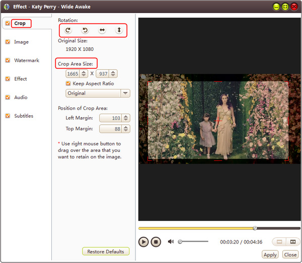 Besides, you can also check “Keep Aspect Ratio” option and choose the aspect ratio from the drop-down list. Click “Restore Defaults” to restore all settings to default, and preview the real-time effect in preview window on the right.