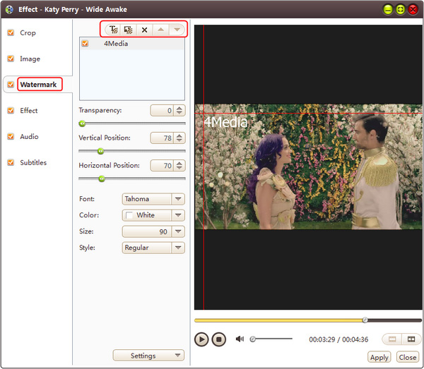 In “Watermark” tab, click “Add Text Watermark” or “Add Picture Watermark” button to import watermarks into the watermark list. Select a watermark and setransparency, vertical position, horizontal position, font, color, size or style.