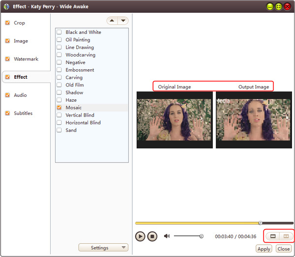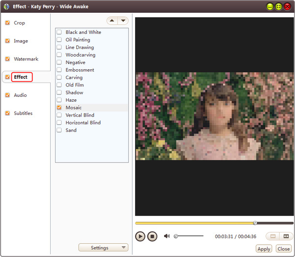 In "Effect" tab, choose one or more effects for the output video from the effect list.