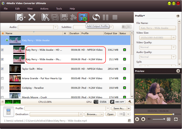 Select the video and click "Add Output Profile" button to set multiple output formats for one file simultaneously. You can get different video formats for various digital players after conversion.