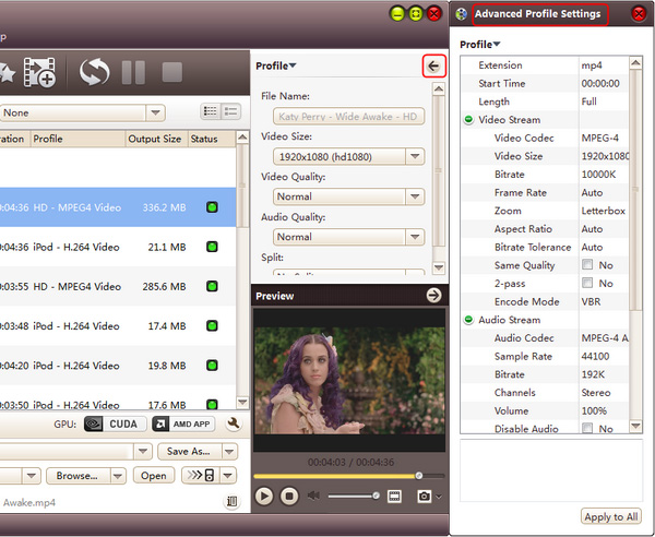 You can also click the "Advanced Profile Settings" button on the top right panel and adjust various video/audio parameters for more needs.