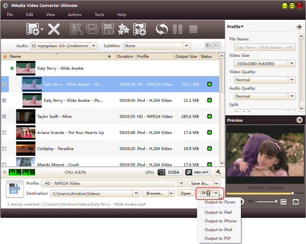 You can transfer converted files to iTunes, iPad, iPhone, iPod, and PSP directly by 4Media Video Converter.