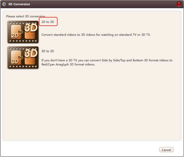Choose the file you want to convert in the file list, and Click "3D" button on the toolbar to enter "3D Conversion" window.