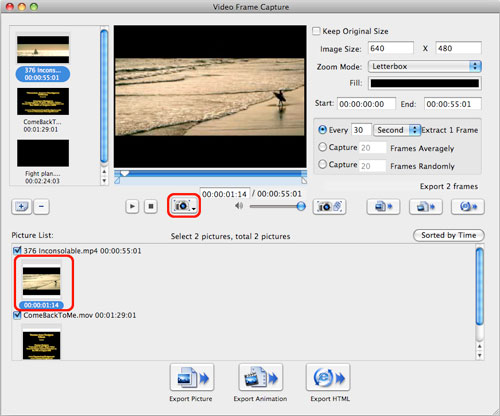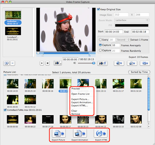 Before exporting pictures, you can preview the pictures in the picture list by right-click. If you're not happy with the picture you capture, right click the picture and select "Open Frame List" to enter the frame window, and choose your favored one to replace the selected one. Or choose "Clear" or "Delete" to clear all the pictures or delete the selected pictures in the picture list.
