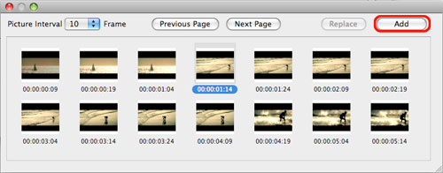 If you choose "Capture from Frame Window", then the frame window will pop up, the current frame will be highlighted by default. Click the "Add" button to add the frame to the picture list. If you're not satisfied with the frame, then choose the best picture you want from the frame list and add it to the picture list. Set "Picture Interval" and click "Previous Page" or "Next Page" button to browse more frames.